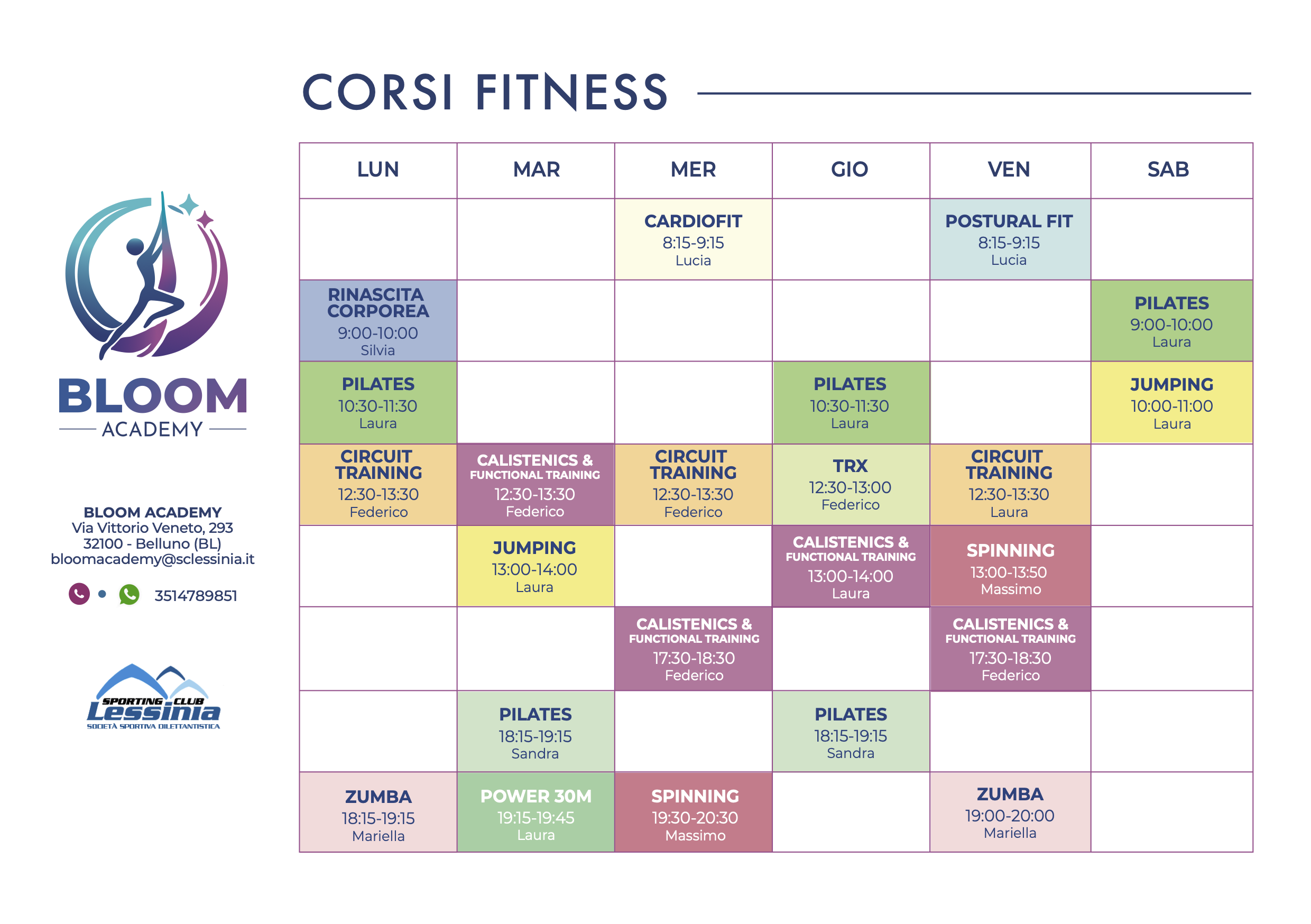 Il palinsesto Fitness di Bloom Academy propone corsi fitness strutturati e diversificati, pensati per accompagnarti verso ogni obiettivo di benessere e forma fisica, indipendentemente dal tuo livello di partenza.